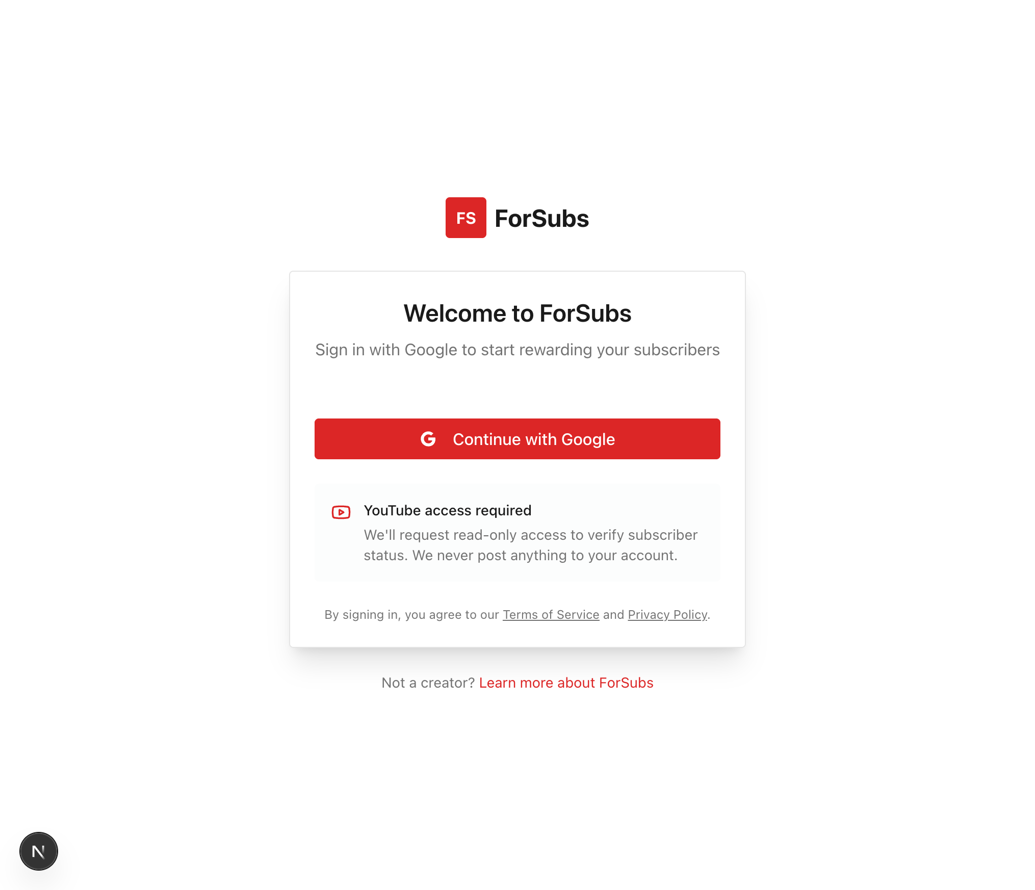 Go to ForSubs and click "Sign in." You'll use your Google account—the same one connected to your YouTube channel.